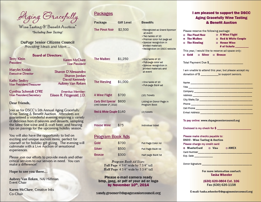 The goal is to have enough responses for two tables so that would make the individual tickets $60.00/each for early bird purchase through October 1st. Single tickets are $75.00. It is a fun event for a wonderful organization that helps seniors in DuPage County remain in their homes! DSCC serves over 250,000 meals per year, 210,000 well being checks and 1000 yard clean ups in addition to maintenance repairs! They can only continue these services with successful events like the Wine Tasting! Attached is the brochure with the sponsorship, auction, donation form. If you are interested or know anyone who might be interested, please contact Karen McClure, the 2014 Wine Committee Co-Chair by calling (630) 279-5566.